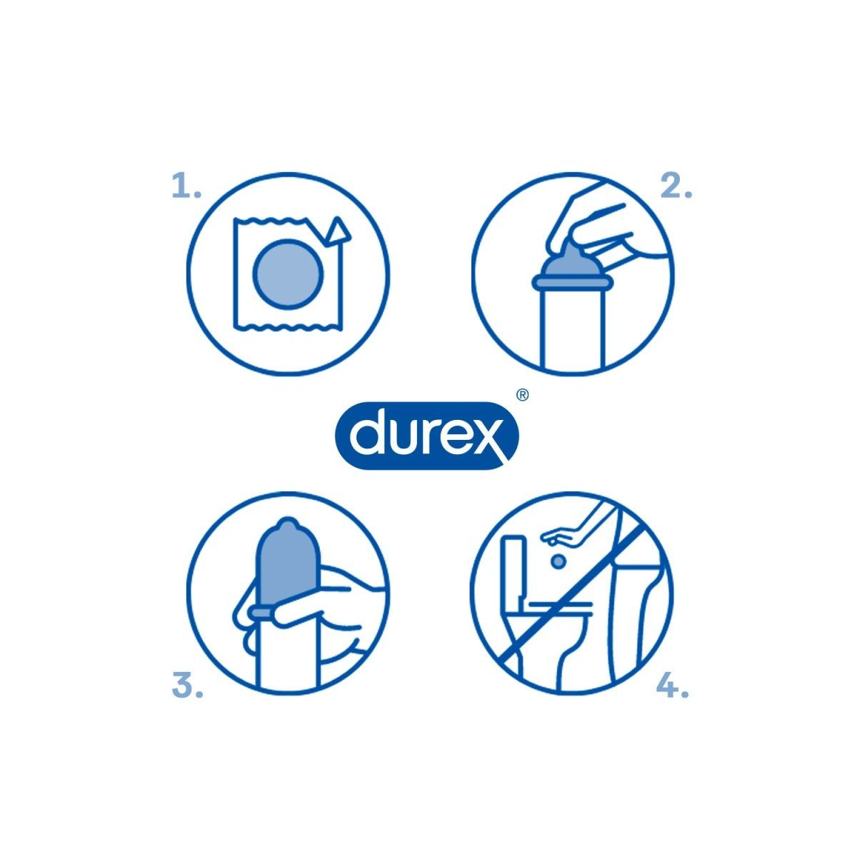 Použití - Stiskněte & protlačte pro návod k použití. Uzavřete pro pozdější použití. Pečlivě si přečtěte návod na použití uvnitř krabičky, zejména pokud používáte kondomy pro anální nebo orální sex. Žádná antikoncepční metoda Vám nemůže poskytnout 100% ochranu proti otěhotnění, HIV či jiným pohlavně přenosným chorobám. Umístění loga Durex na fólii Vám pomůže nasadit kondom správnou stranou hned na první pokus. Logo indikuje spodek kondomu. Používejte pouze lubrikanty doporučované pro používání s kondomy. Při análním sexu použijte další lubrikaci na vnější stranu kondomu. Kondom je pouze na jedno použití. Vyhoďte fólii a použitý kondom do odpadkového koše. Nesplachujte do záchodu.