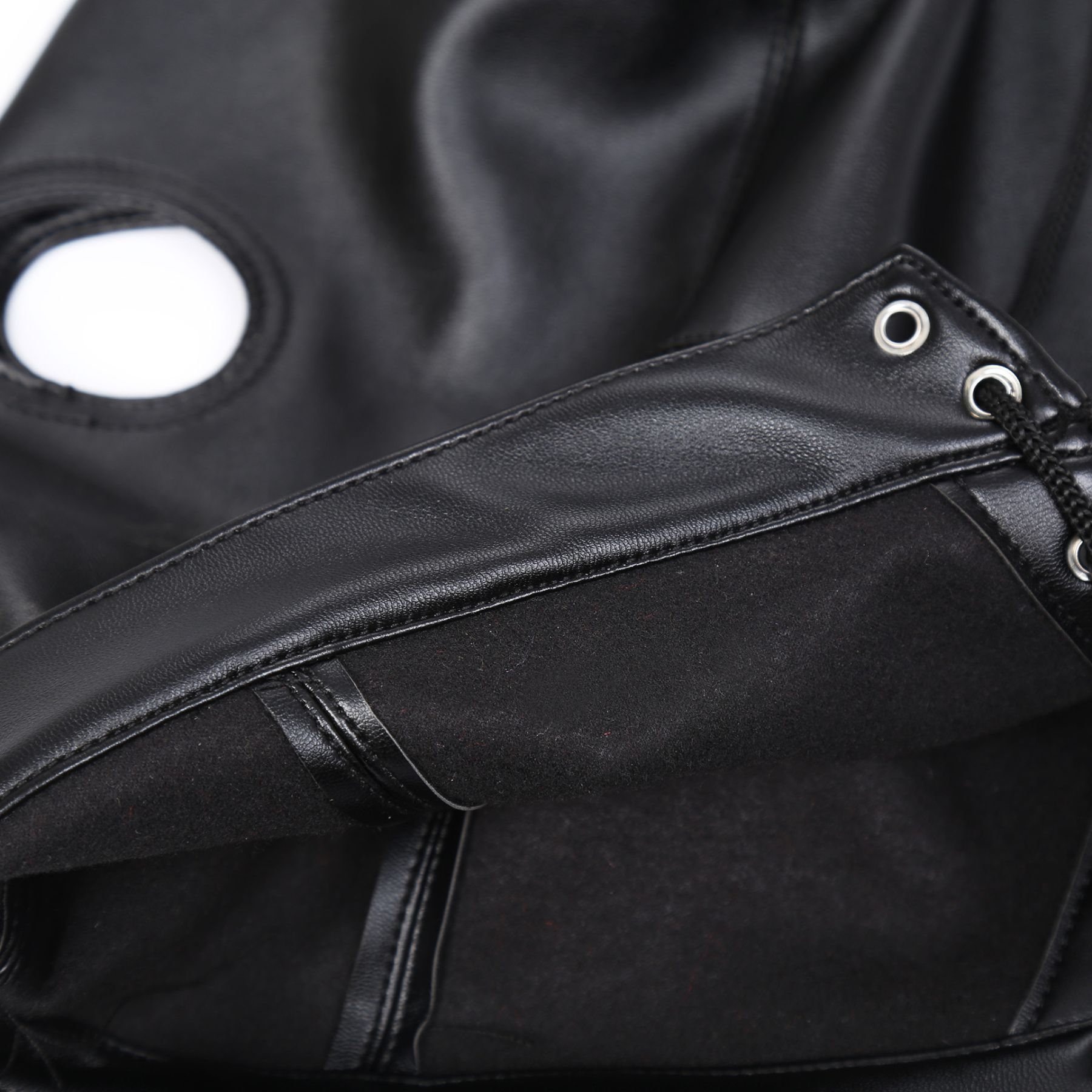 Tenká koženková látka v dominantní černé barvě po utažení pomocí praktického šněrování na zadní straně parádně přilne k obličeji a zvýrazní jeho přirozené křivky.
